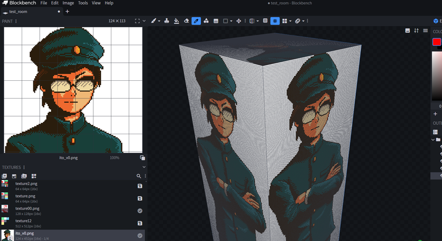「お絵かきソフトで描きつつ、Blockbenchで更新して確認」を繰り返して四角形に命を吹き込んでいきましょう。