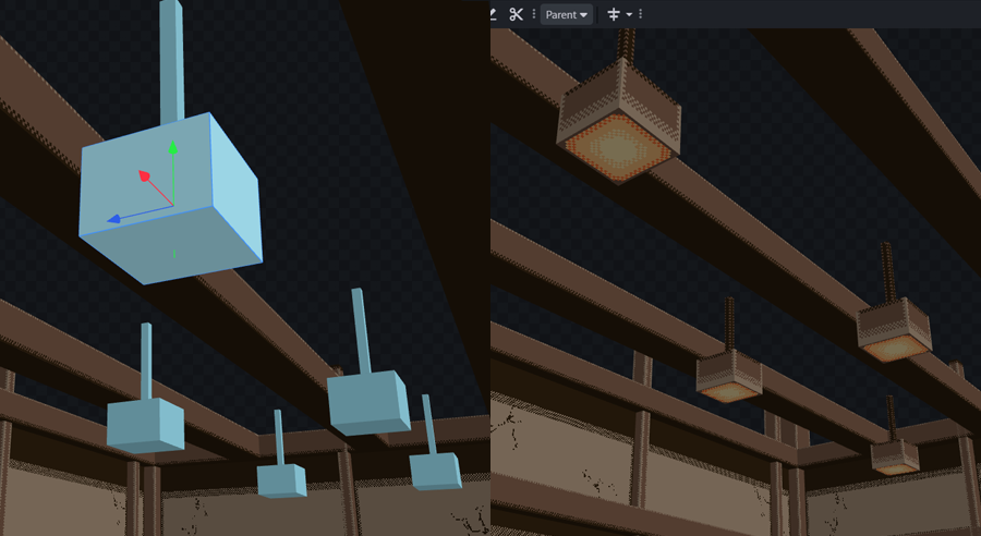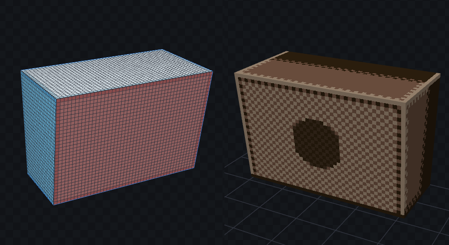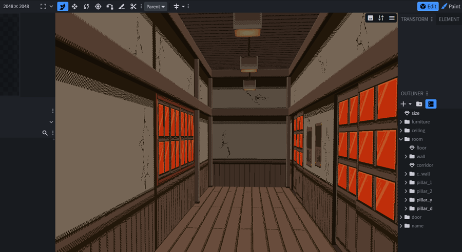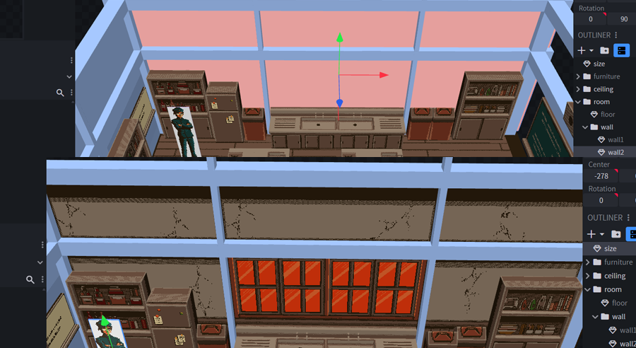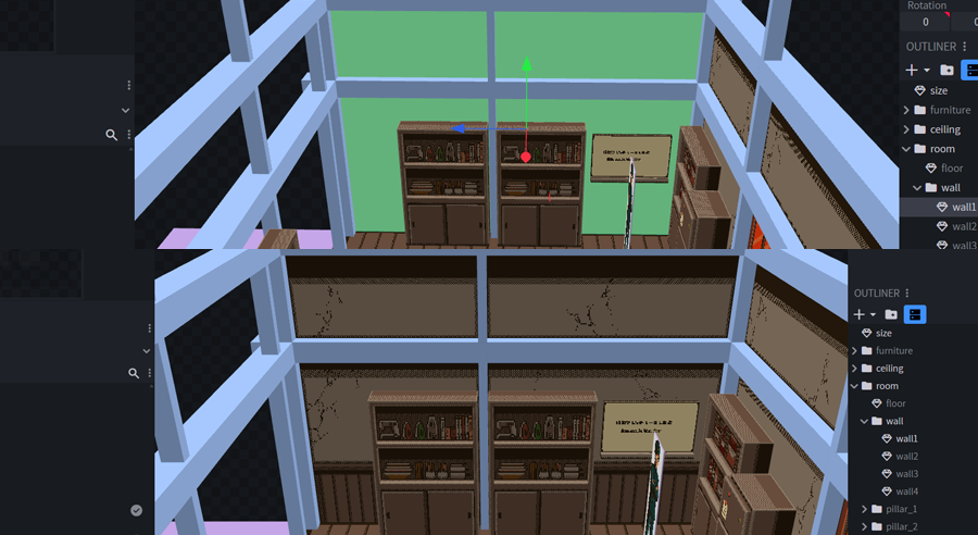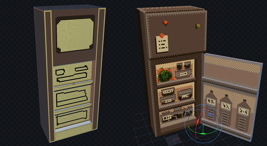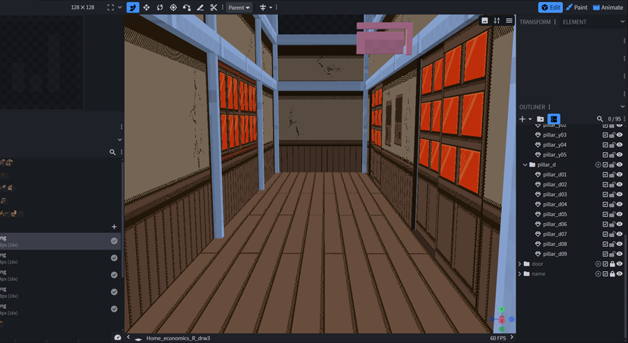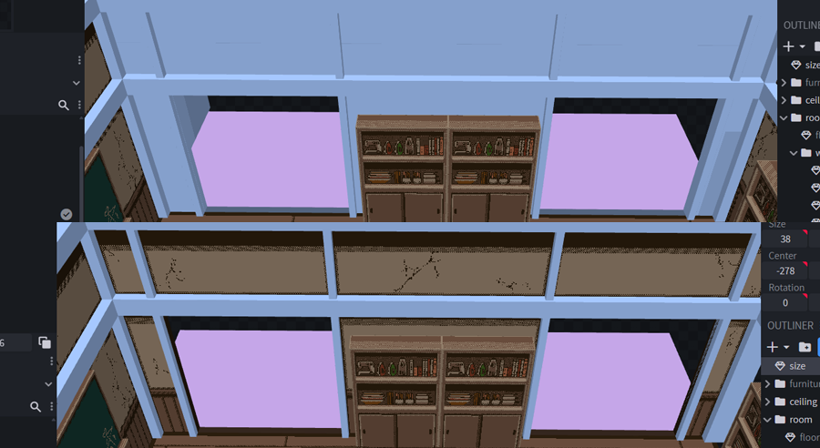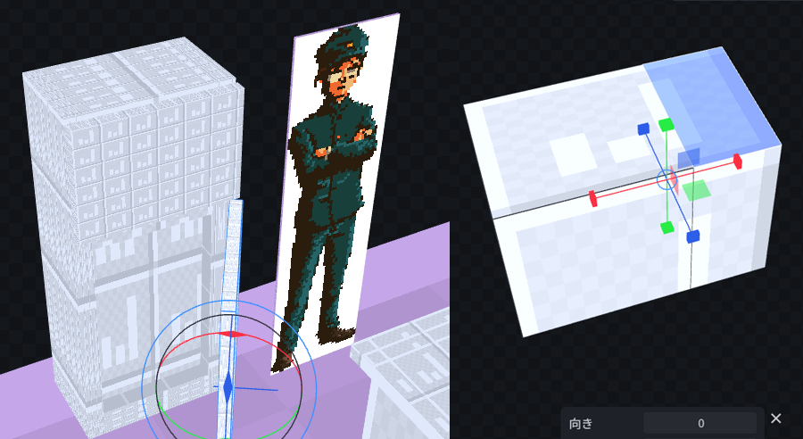 背景を平面で描くことの難しさ・カメラアングルでの自由な角度調整・ドット絵の立体的雰囲気などのメリットから3D背景に手を出しています。
