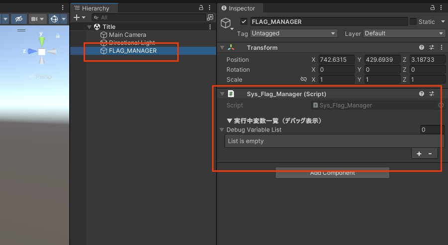 「Flag_Manager」スクリプトは、スタートScene(タイトル画面Scene)に設置しておきます。