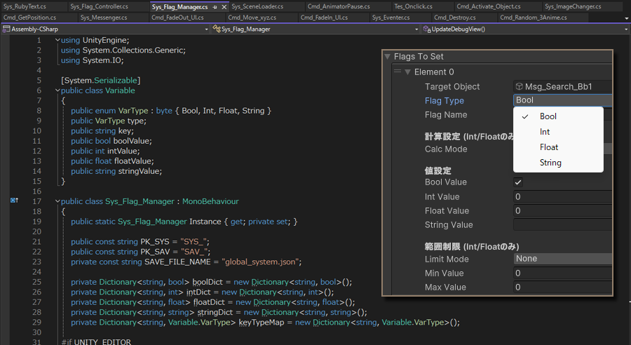 上記「Sys_Flag_Manager(Auto-Generated)」のインスペクターに随時表示される仕組みになっています。