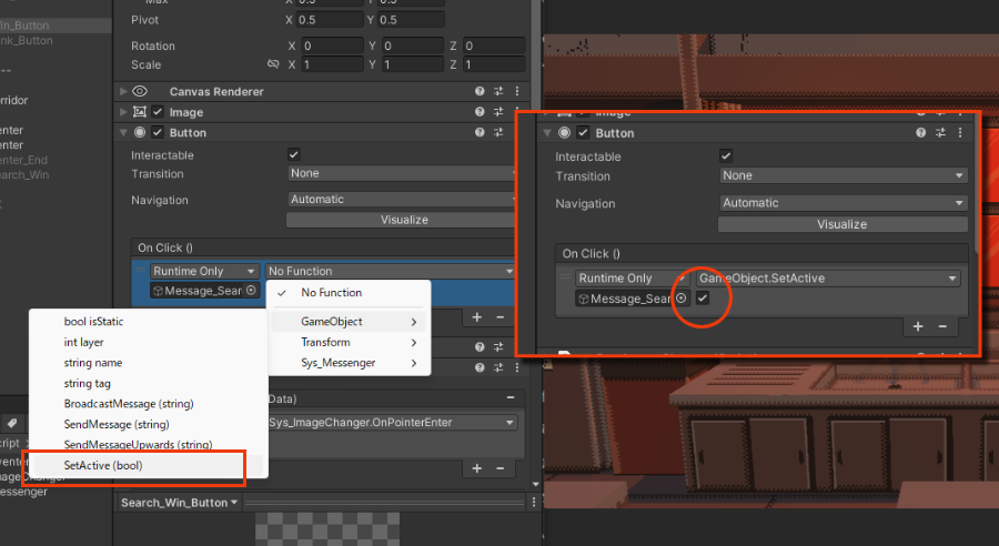 「ボタン」クリックで指定の非アクティブオブジェクトをアクティブにする際、(bool型でのスイッチ方法)