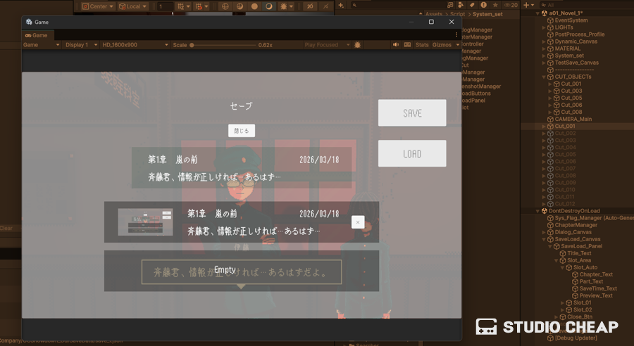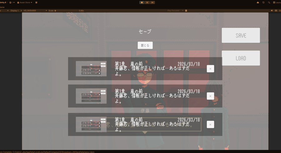 セーブロード構築の第二段階、専用UIを組み込んでいきます。