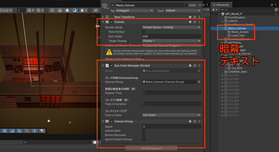 └ displayTime // 暗幕の最低表示時間(Inspectorで調整可能)