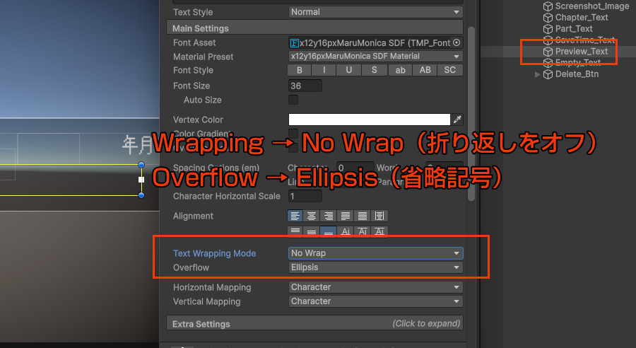TextMeshProの設定のみで対応可能。