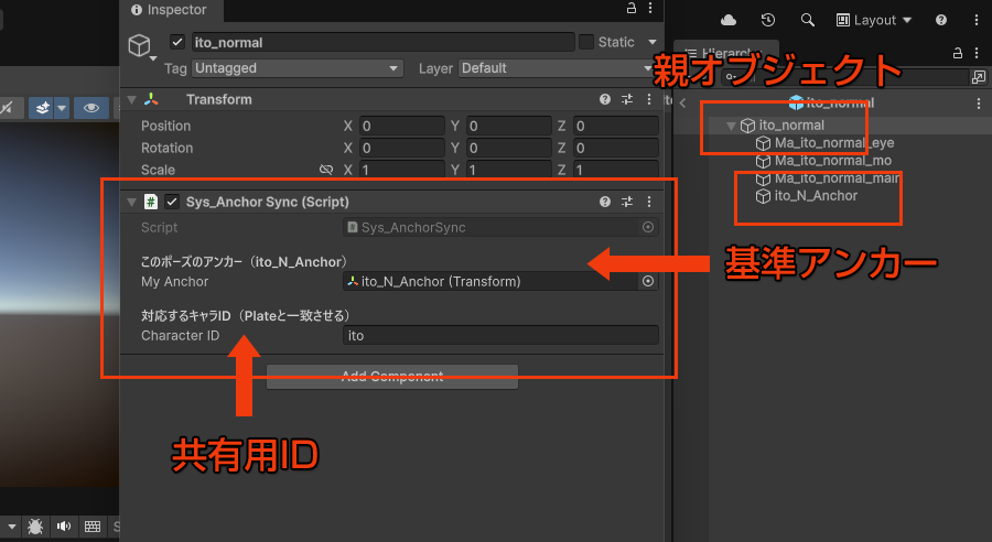 ポーズ Prefab(親オブジェクト)に Sys_AnchorSync をアタッチし、